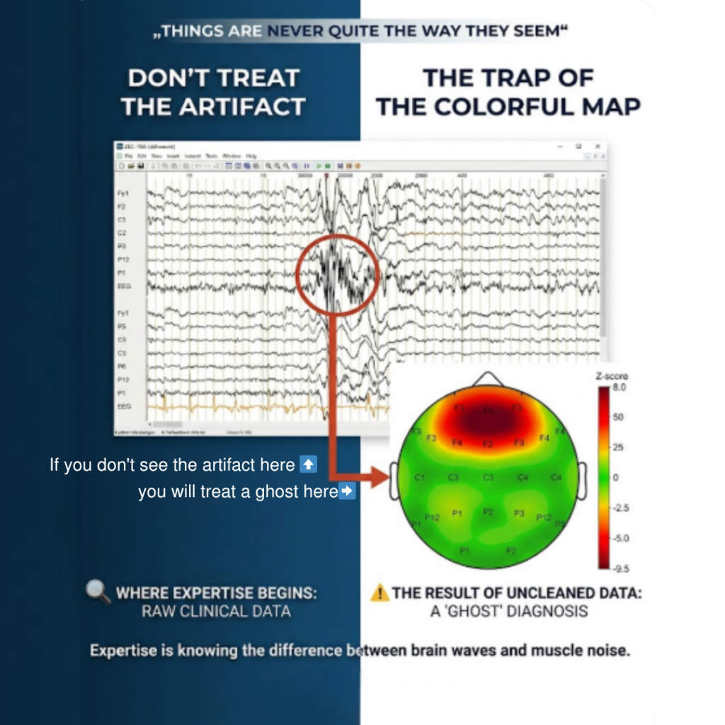 Das Problem bei vielen, die mit QEEG beginnen, ist nicht mangelndes Engagement. Das Problem ist, dass viele gar nicht ahnen, wie massiv Artefakte und methodische Fehler  die Datenqualität beeinflussen. Muskelaktivität, Augenbewegungen, Elektrodenprobleme oder auch die Müdigkeit des Patienten tarnen sich oft als neuronale Signale.